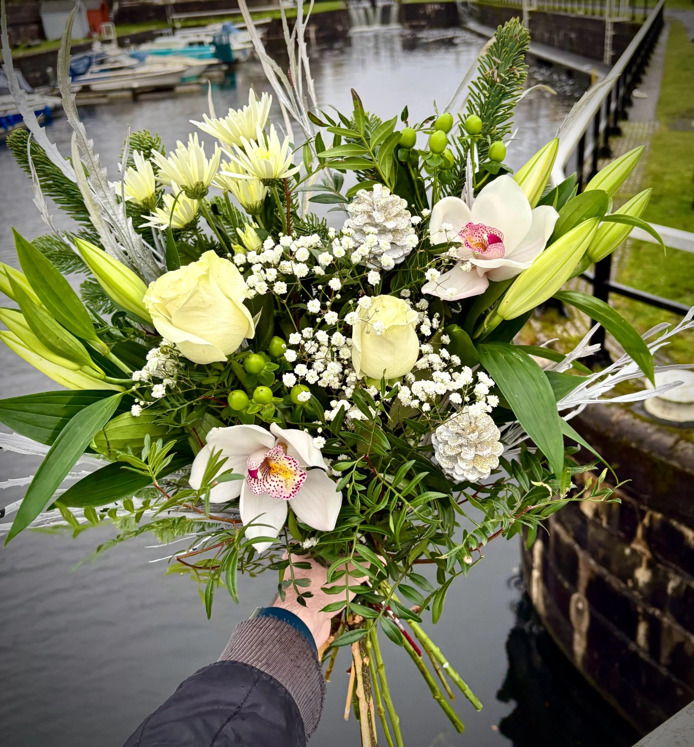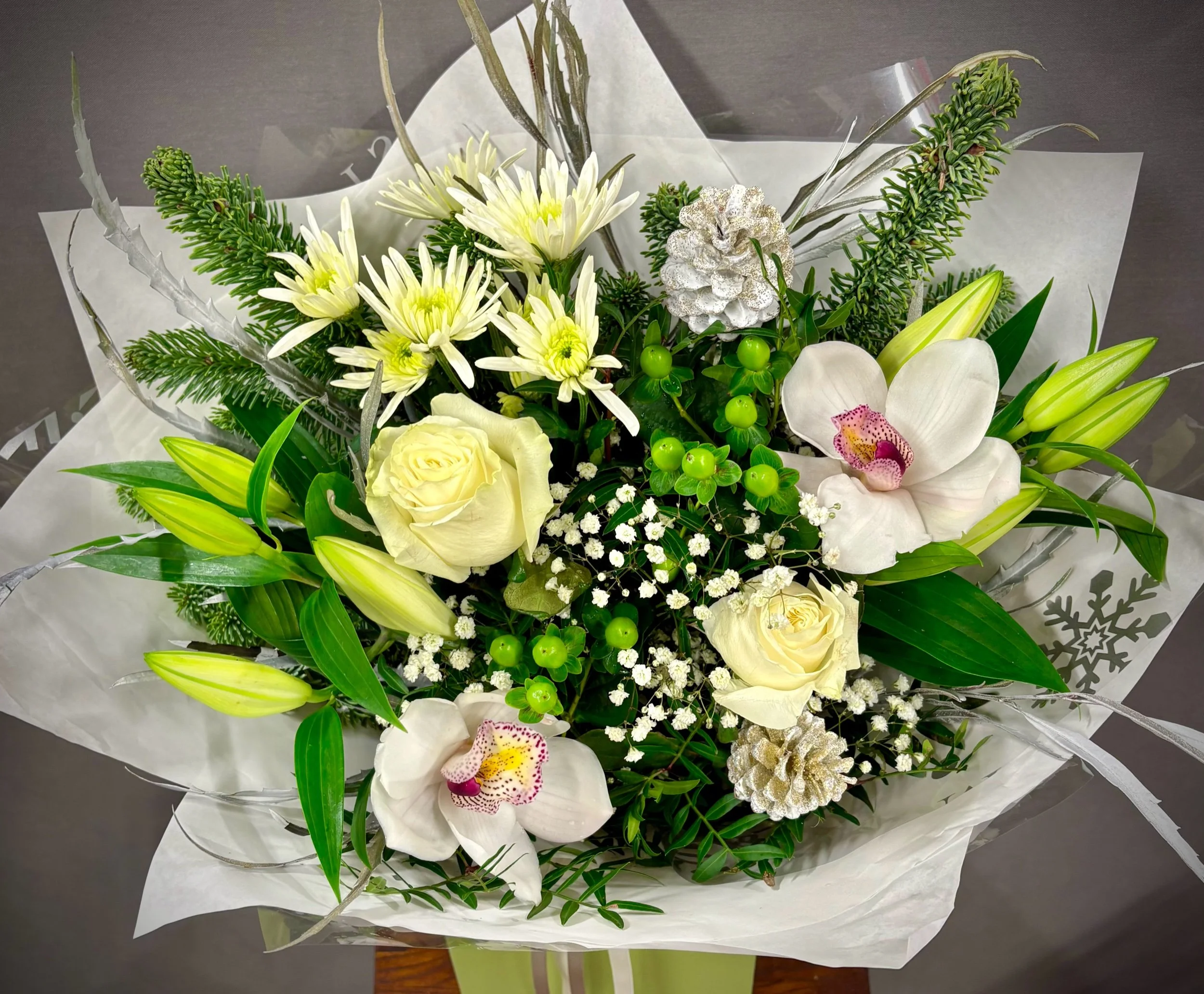 A snowy mix of festive whites and greens. Including Roses, Cymbiduim orchids, Lilies, Hypericum berries, Chrysanthemums, Gypsophilia, snowy pine cones and mixed festive foliages.