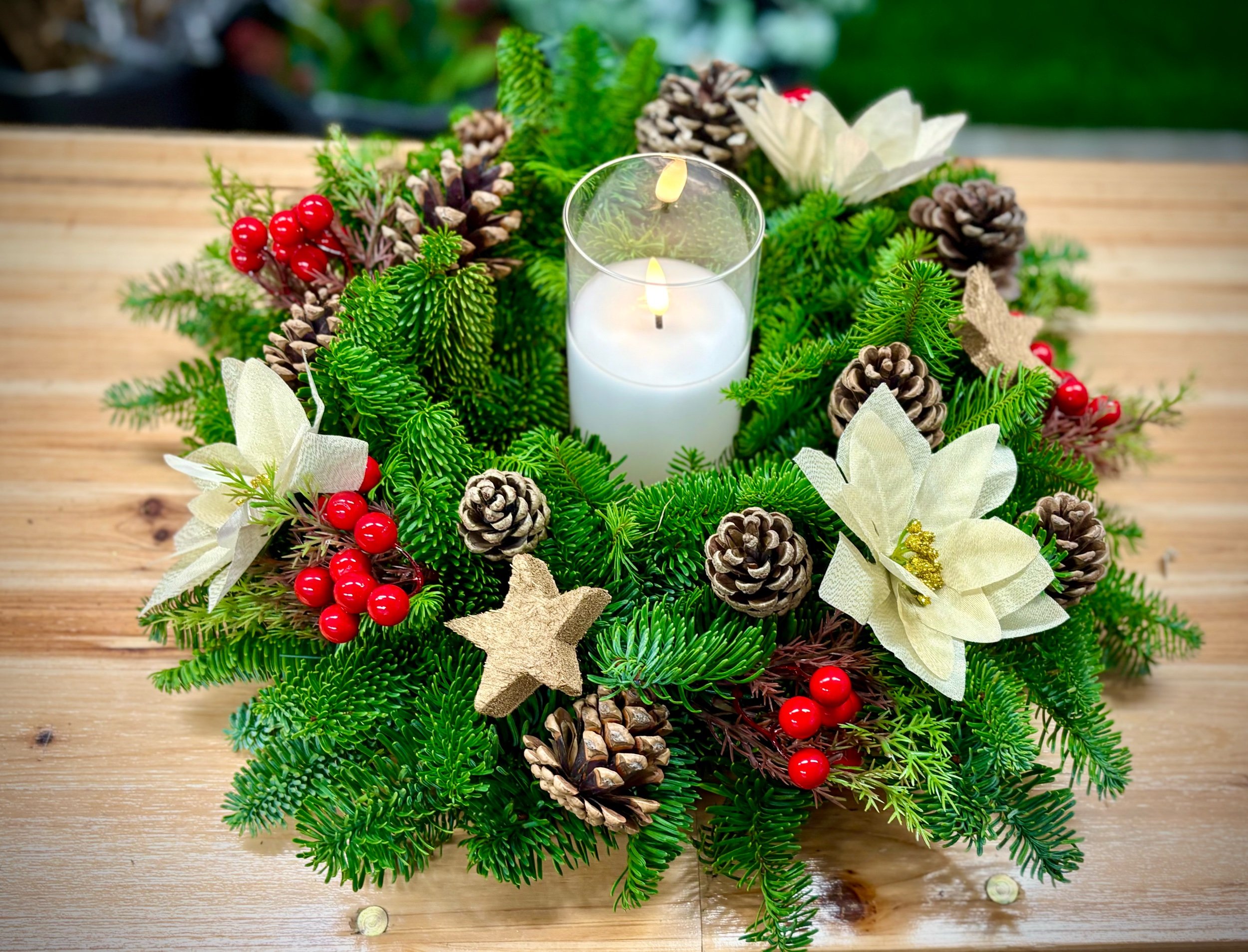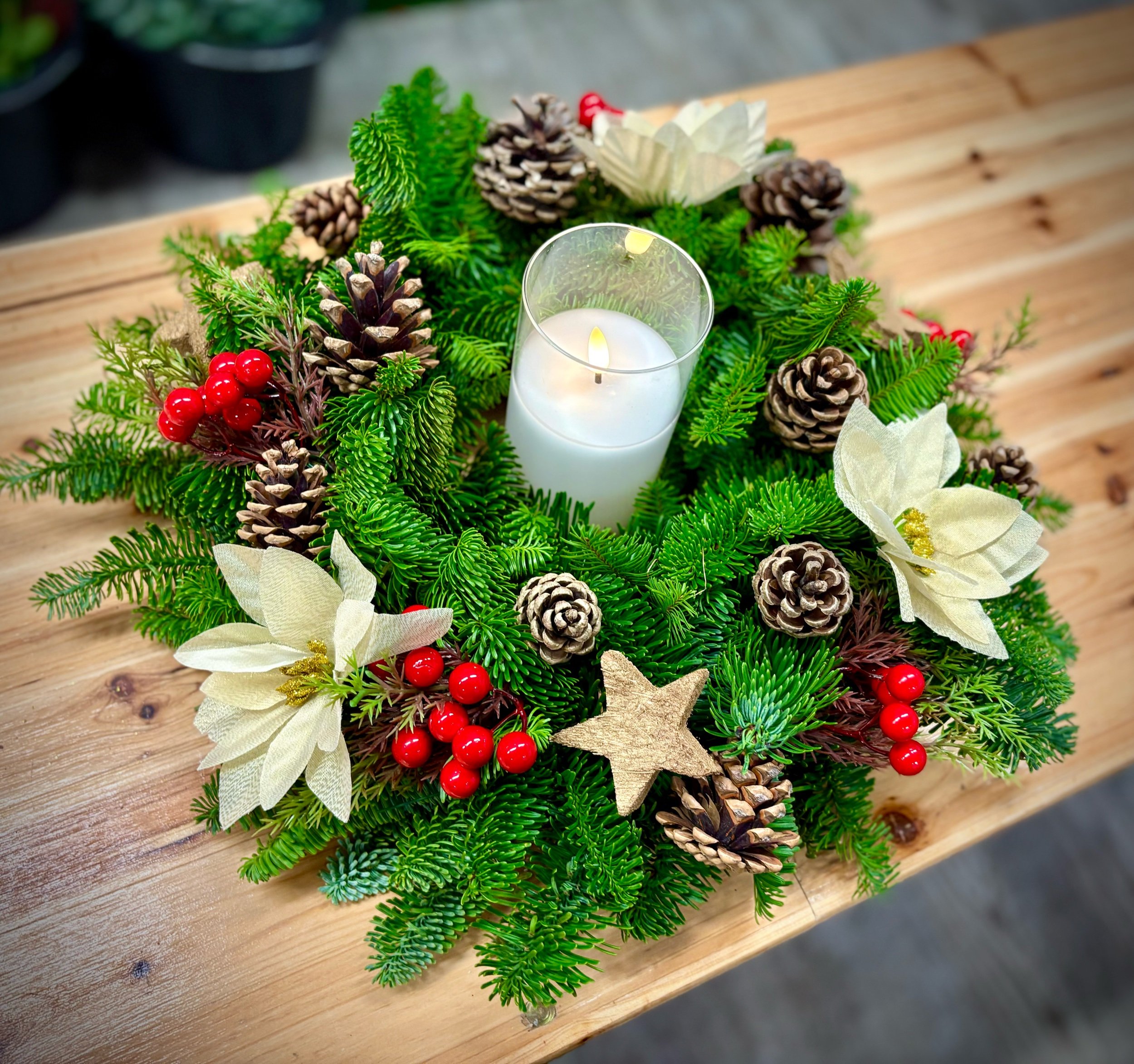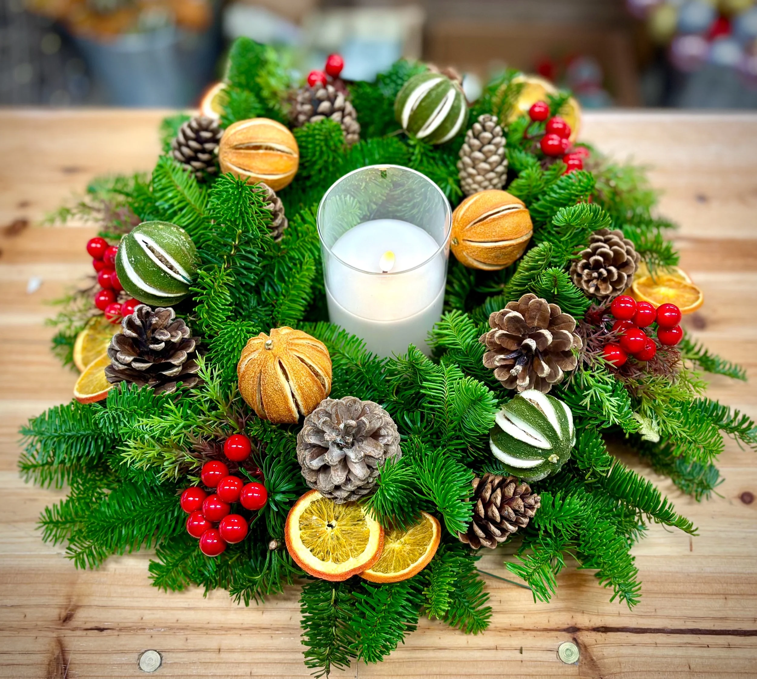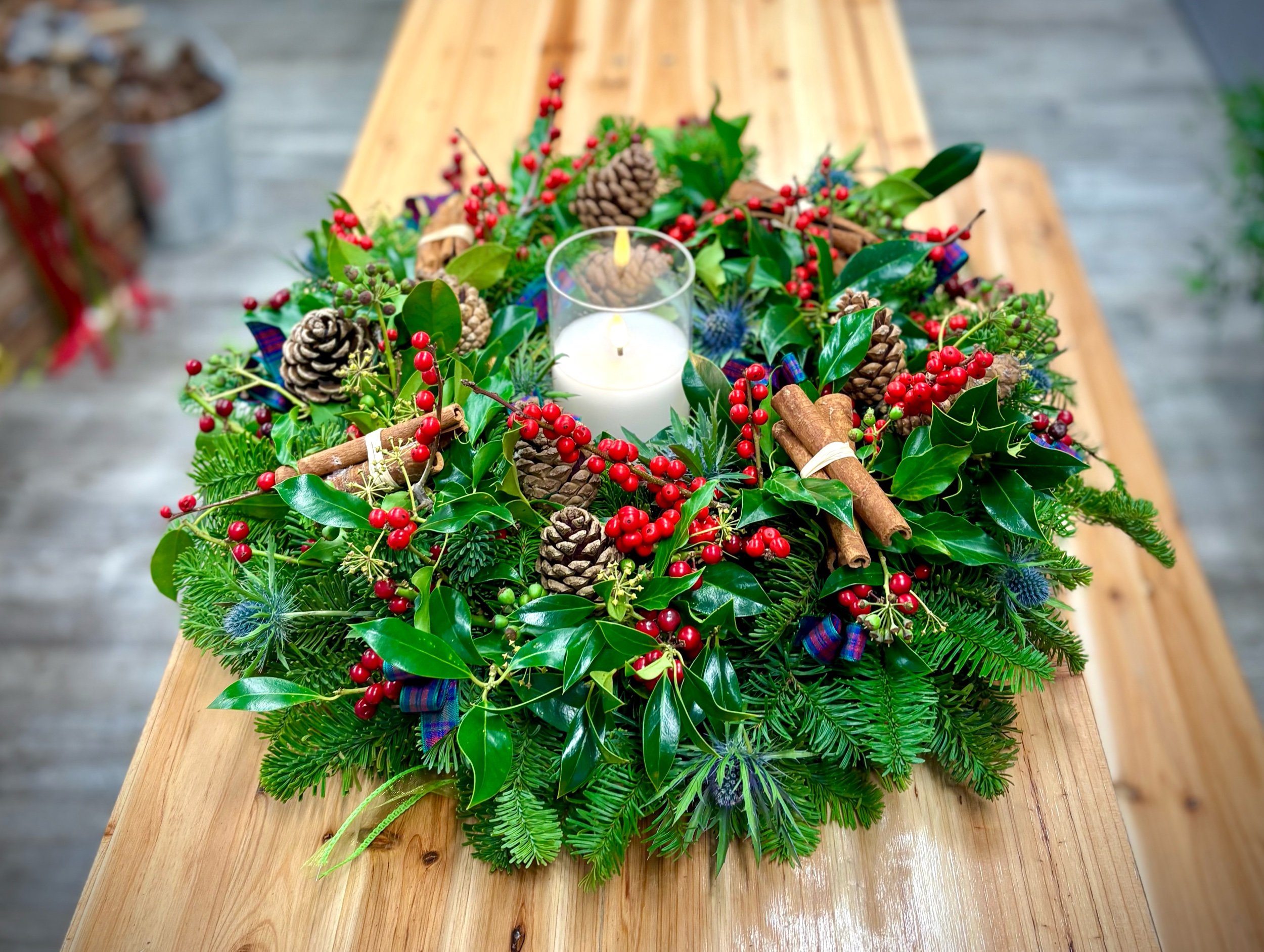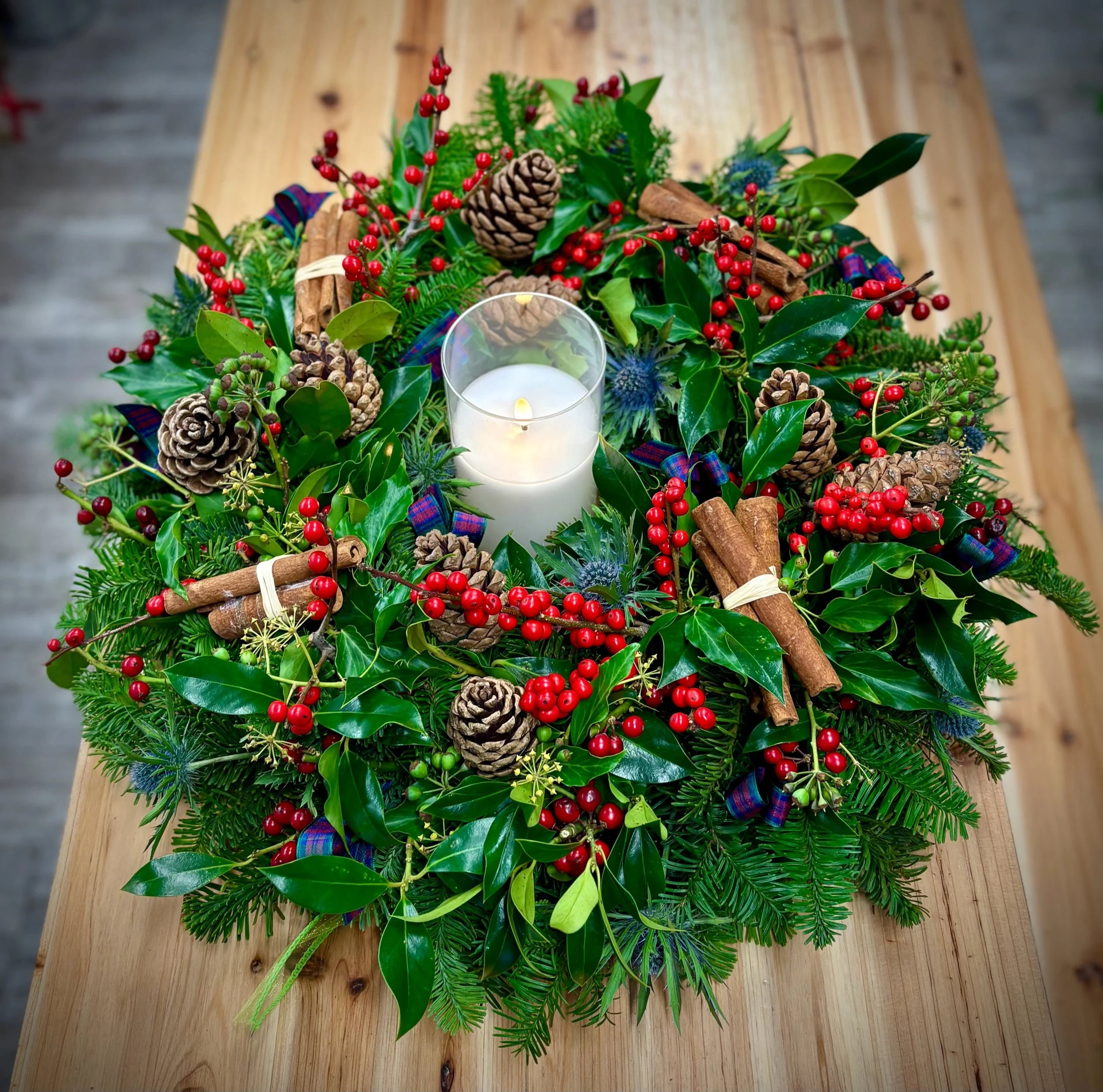 Christmas › Table centre wreath Image 1 of 7 Image 2 of 7 Image 3 of 7 Image 4 of 7 Image 5 of 7 Image 6 of 7 Image 7 of 7 Table centre wreath from £45.00 A festive wreath centre piece with optional LED pillar candle.10” - approx 42 cm wide12” - approx 55cm wide Add LED candle: Select Add LED candle yes no thanks Colour theme: Select Colour theme pine cones and berries dried fruits gold stars and poinsettias tartan ribbon and cinnamon Size: Select Size 10" 12" Quantity: Purchase Added! A festive wreath centre piece with optional LED pillar candle.10” - approx 42 cm wide12” - approx 55cm wide