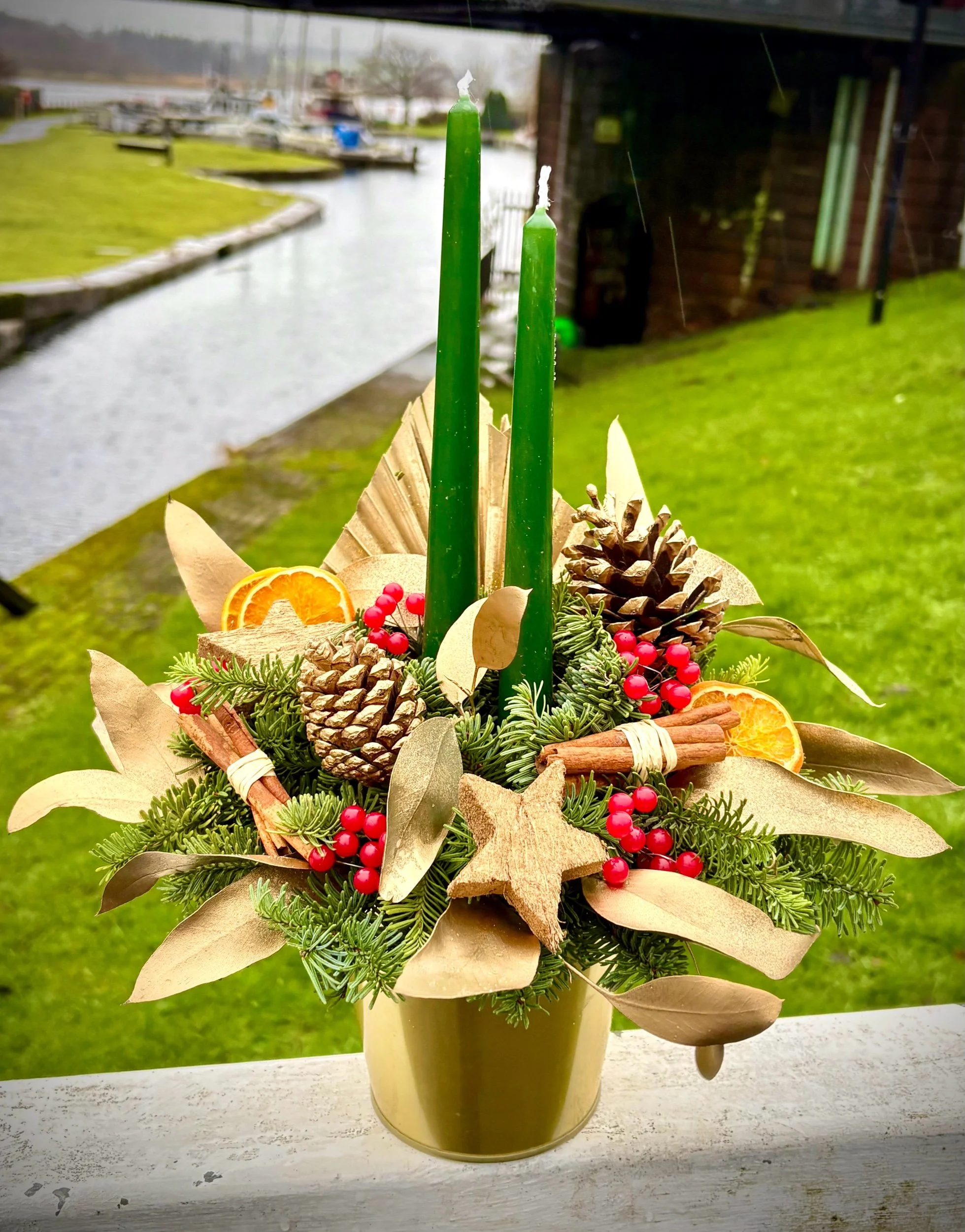 Christmas › Blitzen Image 1 of 2 Image 2 of 2 Blitzen £30.00 A festive arrangement in a gold pot, including two taper candles, mixed foliage and festive accents. Quantity: Purchase Added! A festive arrangement in a gold pot, including two taper candles, mixed foliage and festive accents.
