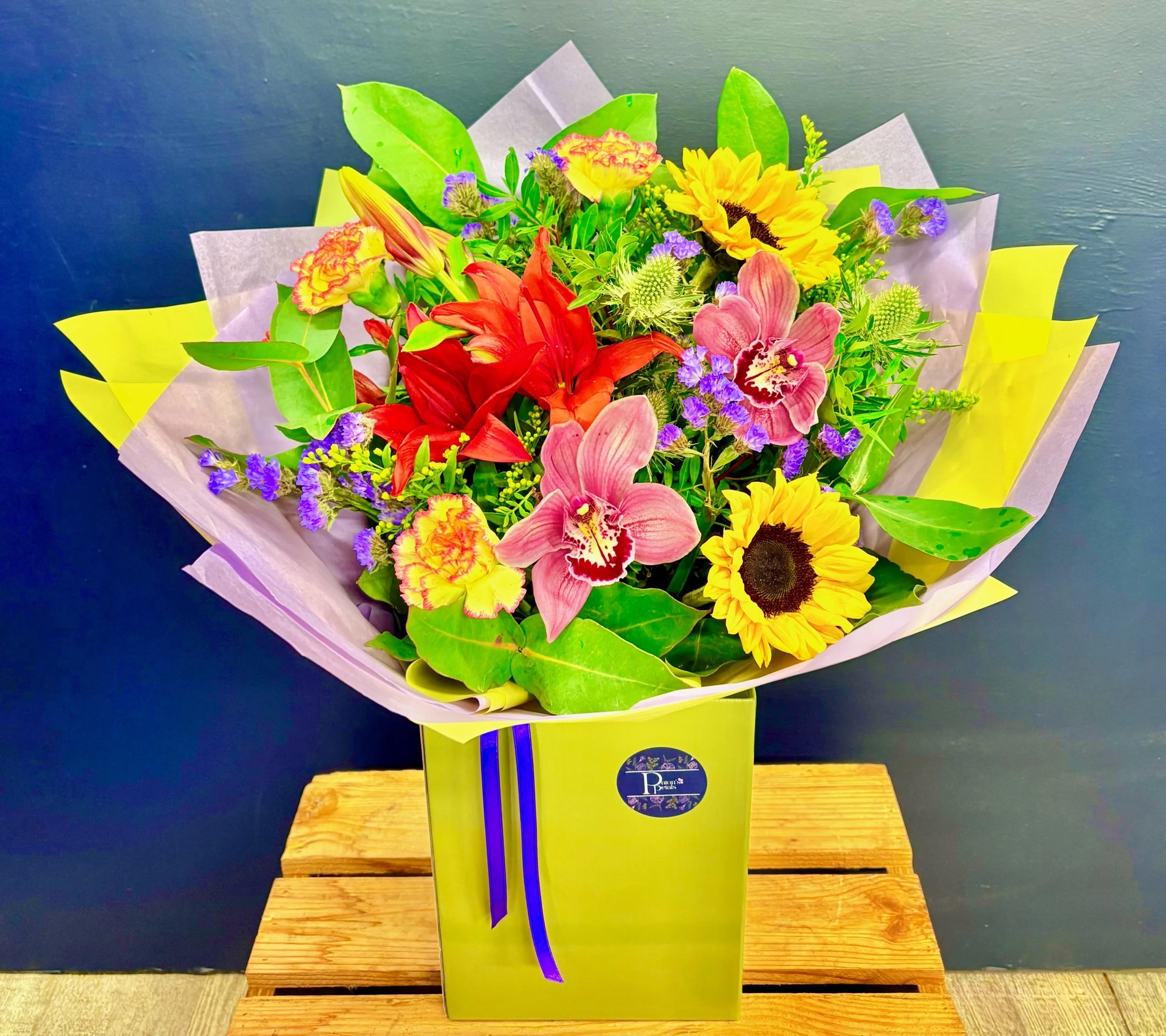 A vibrant mix of colourful blooms, including Sunflowers, Lillies, Cymbidium Orchids, Carnations, Statice and mixed seasonal foliage.